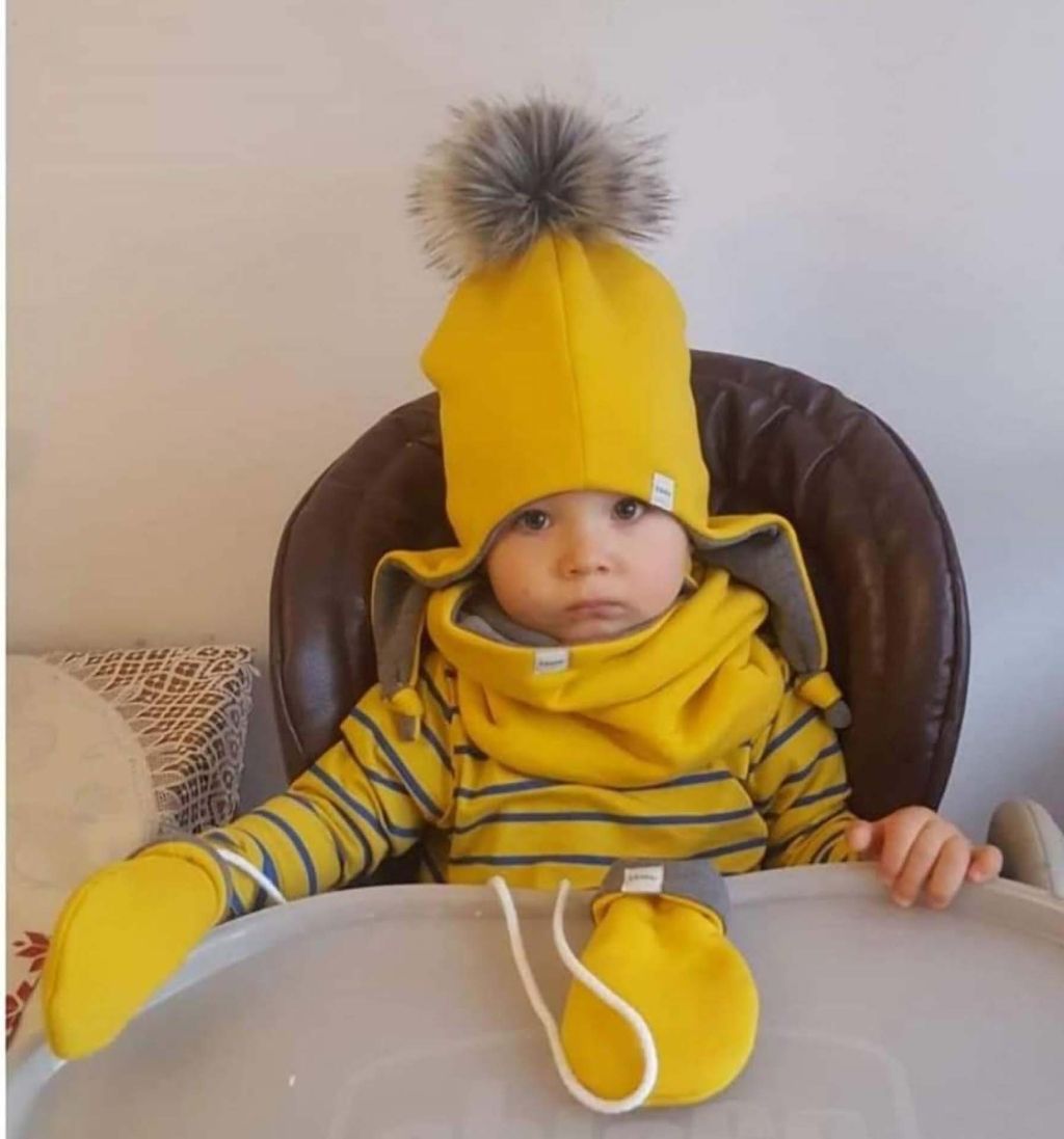 Czapka pilotka bardzo cieplutka przylega dobrze do uszek, komin oraz rękawiczki bez palcy, zapewnią ciepło nawet w największe mrozy.